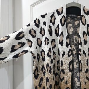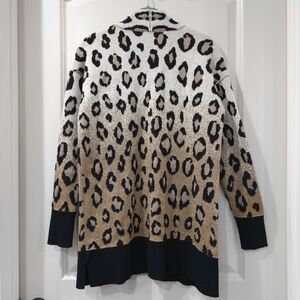 Great condition minus one call out. There is a thread pull on the back side of the cardigan. Hard to spot and can most likely be fixed. Priced with this consideration. Knit has gold metallic thread in Ombre Leopard pattern. Dress up or wear casual.