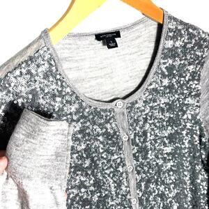 ANN TAYLOR Women’s Light Gray Merino Wool and Silver Sequin Cardigan