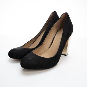 Ann Taylor women's black suede heels with metallic gold block heel