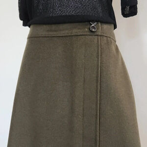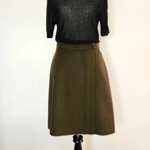 Olive green skirt in sz 2 by Ann Taylor. This is an a-line style skirt, faux wrap, buttons, zip closure w/ hook and eye. This lined.