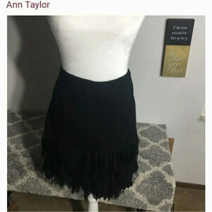 Like new condition Ann Taylor black skirt with three tiered feather trim. Hidden side zipper, elastic waistband. Fabric does have some stretch to it. Sexy, flirty, fun cocktail skirt! Add some feathers to your wardrobe!! Size 4P. From smoke and pet free home. No flaws.