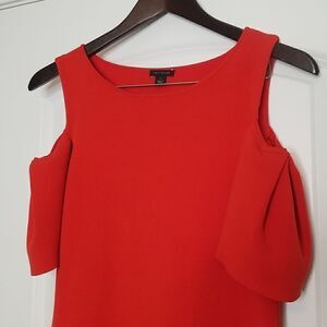 Lovely red cold shoulder sheath dress. Stretchy ribbed knit. Scoop neckline. Bell short sleeves. Great structure.