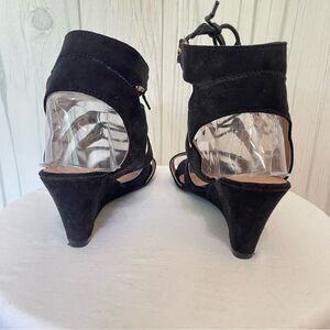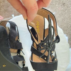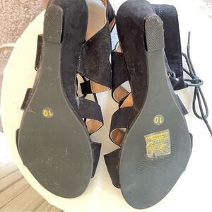 Striking black strappy wedges that lace up to the ankle with gold-tone hardware. See last photo for show length measured from bottom of shoe. Think this is closer to 9.5.