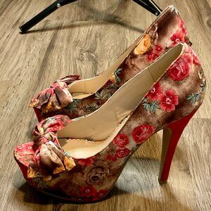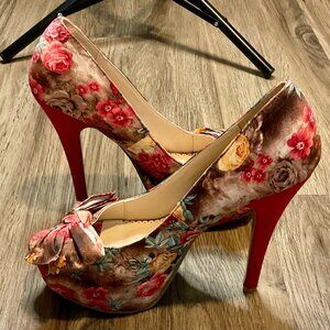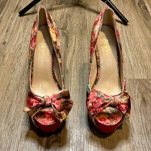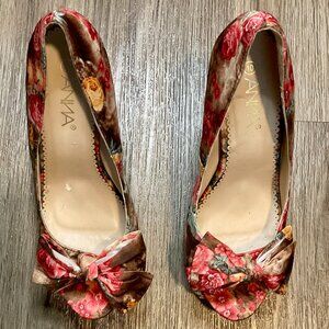 ANNA Five Inch Platform Floral Print Velvet Stilletos Heels Open Toe Bow Size 10