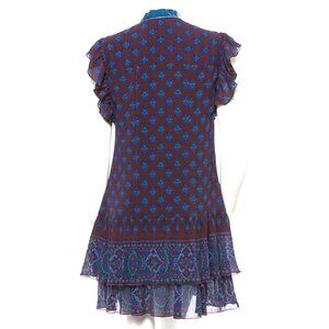 Great ANNA SUI burgundy, blue, and purple medallion print silk/wool muslin fabric mini dress with front button closure and blue velvet ribbon tie at neck. The same fabric was shown on her Fall 2009 runway in a dress and skirt ensemble. Fabric is 71% Silk, 29% Wool; Lining: 100% Acetate. A size 6 or small/medium; measurements below.