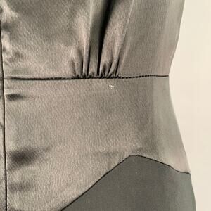 ANNA SUI cocktail dress in a black polyester featuring a mixed fabrics design, short puffy sleeves, and V-neck with ribbon accent. Made in USA.