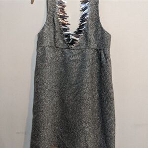 Dress is gray and white boucle-type fabric with subtle silver shimmer