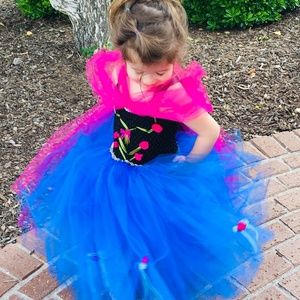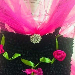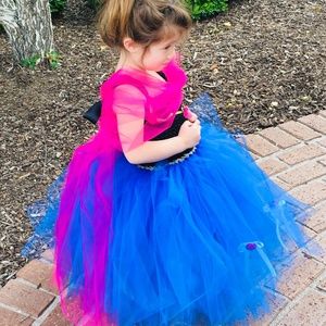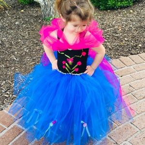 ANNA couture tutu costume - custom made couture, super cute hand-tied full and fluffy tutu dress with coordinating satin ribbon, organza ribbon and wide satin bow. Bodice contains organza and satin ribbon embroidered look with satin ribbon roses. Organza fuchsia flowing cape with rhinestone front button. *(available in ankle length) Additional sizes available at www.adinaballerina.com
