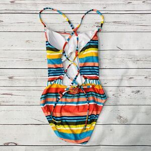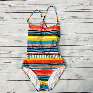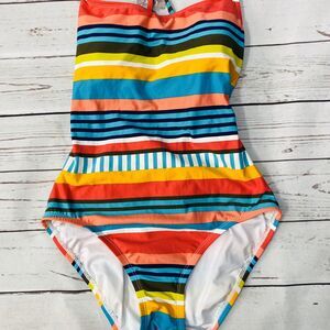 ANNE COLE Tropication Criss-Cross Back Striped One Piece Swimsuit 6 Pink Teal