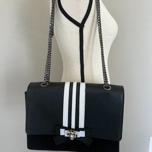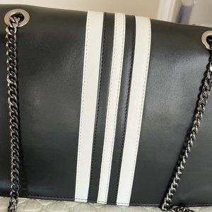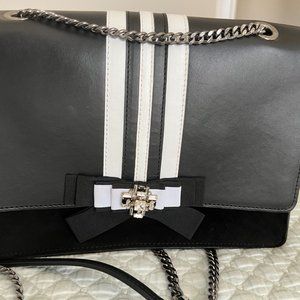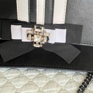 Anne Fontaine Black / White Onight Crystal Embellished Calfksin Leather and Suede Shoulder Bag. Condition: Excellent, only used twice. As with all suede items, the suede portions of this bag are delicate and may have a slight discoloration (due to the nap in the fabric) and minor indentations (due to the soft, supple material). Interior condition: Very good condition Please refer to photos. Material: Leather Fabric content: Shell - 100% Calfskin leather / lining - 100% cotton / hardware - 100% brass Care: Do not wash / do not bleach / do not tumble dry / do not iron / do not dry clean Includes: Dust bag and booklet are both included. Country of origin: Imported Date / Authenticity code: H18A105 Measurements: 10.75"L x 3.5"W x 7.5"H Exterior pockets: N/A Interior pockets: One open pocket and one zip pocket Handles: Adjustable shoulder strap Handle drop: 14" - 25.5" (Adjustable) Closure: Front flap with magnetic snap button close Interior lining: Black cotton Hardware: Gunmetal-tone Color: Black Category: Bags Subcategory: Handbags Sub Sub Category: Shoulder bags Model: Other Item number: 15299-591 G-S23-DI ** Photos are of the actual item ** **