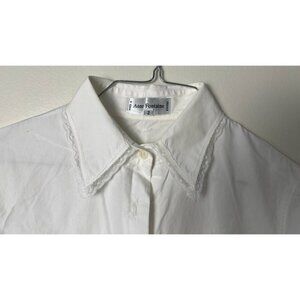 ANNE FONTAINE FRENCH LACE CUFF BUTTON UP BLOUSE IN A MARKED SIZE 2. THE BLOUSE FEATURES A TAILORED BUTTON UP DESIGN WITH FRENCH CUFFS WITH FRENCH LACE DETAIL IN WINTER WHITE. GREAT CONDITION.