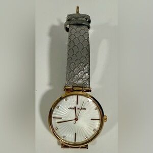 ANNE KLEIN AK GOLD TONE CRYSTAL LIGHT GREY GENUINE LEATHER BRACELET WATCH