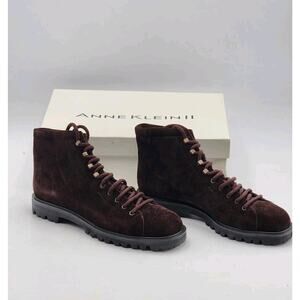 ANNE KLEIN Ander Brown Suede Combat Booties Size 7 Lug Lace-Up Italy New In Box