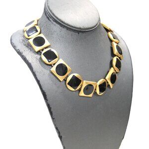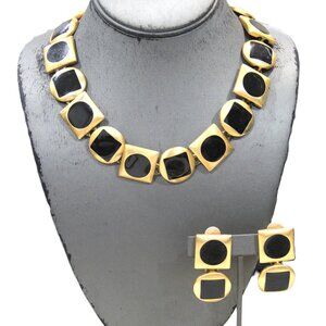 ANNE KLEIN BLACK ENAMEL MATTE GOLD STATEMENT NECKLACE & DANGLE EARRINGS SET