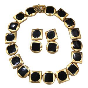 17.5" toggle clasp necklace comprised of matte gold plate and black enamel geometric design. The earrings are dangle clip style. The necklace is signed with her hand tag. Great set in great condition.