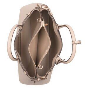 dual top carry handles, detachable adjustable shoulder strap, gold tone hardware, belted trim, triple compartment design, removable brand logo charm, faux leather design