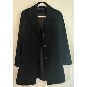 This Anne Klein black wool blend coat is a timeless wardrobe staple, perfect for cooler weather. Designed with a classic tailored fit, it features: