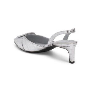 cushioned footbed, crackled metallic finish, slingback strap with buckle and goring for stretch, faux buckle detail, kitten heel