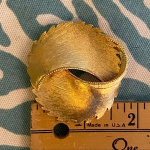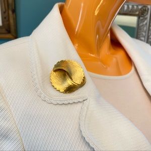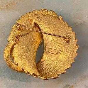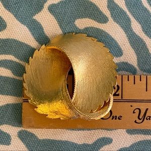 EUC vintage matte gold tone brooch / pin from ANNE KLEIN. Textural leaf motif or ribbon or feather in a swirled circle or sort of Yin Yang pattern.
