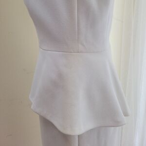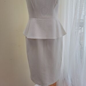Anne Klein white peplum style sleevless dress. Fully lined knee length. Measures 16.5 underarm seam to seam. Waist measures 14" flat. 24" lengthfrom waist.6.5" kick slit in center backbat hem.13" hudden back zipper. Size 2