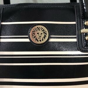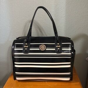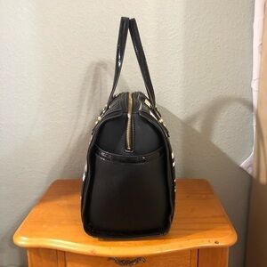 Gorgeous and Klein doctor bag style with zip top closure dual handles and Detachable adjustable Crossbody strap , small pockets on each side inside has one zip pocket two slip pockets has all man-made materials the look of Patton and coated canvas Gold tone hardware very Beautiful and classy