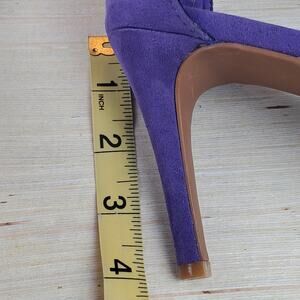Step out in style with these chic Anne Michelle strappy heels! The purplish-blue faux suede offers a unique and eye-catching look. With a 4-inch heel, they're perfect for adding a touch of elegance to your evening wear, date night, or special occasions. Please note the ankle strap is coming apart and there's small damage to the heel, as shown in the pictures. Despite these flaws, they still have plenty of life left and are ready to turn heads!