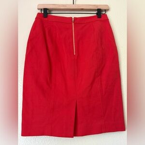 This Ann Taylor pencil skirt in a vibrant red hue is designed for both work and cocktail occasions. Its knee-length cut and tailored fit offer a sleek, professional look, while the subtle front slit adds a touch of sophistication.