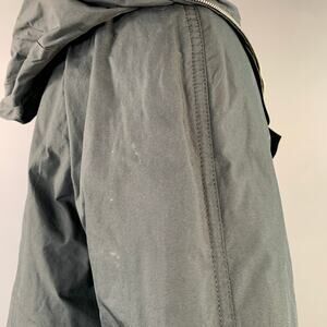 ANNETTE GOERTZ jacket in a black polyester featuring a layered style with detachable hooded & quilted zip up lining, two large patch pockets, and button closure.