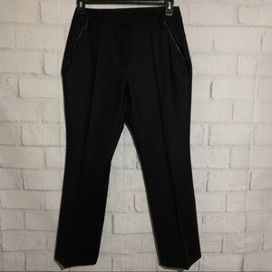 Defined seem down front/back of both legs. Zippers unzip to reveal hand pockets, or can be zipped to provide a tighter fit. Zip fly w/ button closure. Unlined. Belt loops. 96% New wool, 4% Spandex. Pocket lining: 57% Viscose, 40% Polyamide, 3% Elastodiane. Marked European size 42, which is equivalent to a US L(10-12). Dry clean only. Like new. Measures approximately: 15” across waist when pockets are zipped, 16 1/2” across unzipped, 10” rise, 39” outseam, 29 1/2” inseam, 17” leg opening.