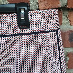 Excellent skirt for office or brunch. Navy blue white and red geometric pattern