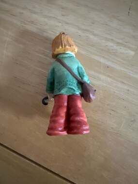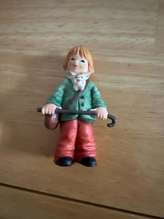 Vintage ANRI Ferrandiz wood figurine featuring a boy with a puppy and walking stick. This hand-carved and hand-painted piece showcases the charming, whimsical style typical of Juan Ferrandiz's designs for the Italian workshop. The boy is dressed in a green jacket and red pants, carrying a small white puppy in his coat. Made in Italy.
