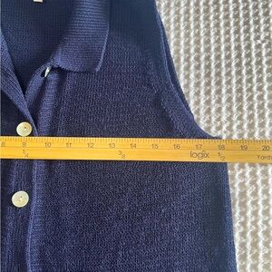 Stylish navy sleeveless cardigan with button-up front. Perfect for layering or wear as a dress making this versatile and timeless.