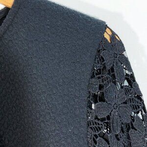 - Delicate lace sleeve offset the structured silhouette.