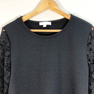 Eri + Ali Delilah Black Long Sleeve Lace Top from Anthropologie. This elegant women's top features intricate lace sleeves, perfect for adding a touch of sophistication to any outfit. The classic black color makes it versatile for both casual and formal occasions.