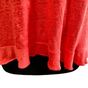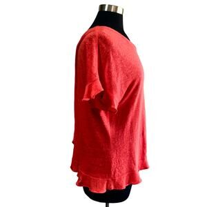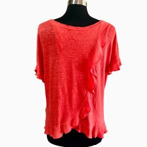 ANTHRO Eri + ali Coral Red Linen Cross Back Flutter Tee SM Beachy Summer Casual. Oversized. Pretty, feminine, and flirty. Cool casual top. Scoop neck. Ruffled hem and sleeve as well as down the back at crossove. 100% linen.