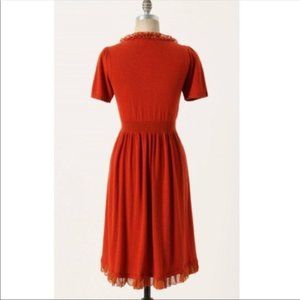 A burnt-orange sweater dress with short sleeves and chiffon ruffle trim by Isabella Sinclair for Anthropologie. It has an elastic waist and the fabric has a decent amount of stretch.
