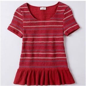 Short sleeve top with blue and white embroidered smocked stripes and a peplum bottom. Stretchy