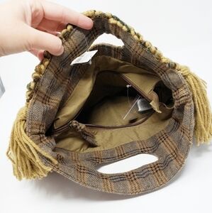 Woven with shimmering sequins and finished with a delightfully tasseled edges, this statement-making clutch is an ideal addition to your party ensembles. Fun plaid back perfect for fall. Cotton, polyester, acrylic, wool; cotton lining. Inner slip pocket. Zip closure