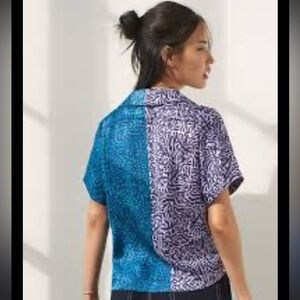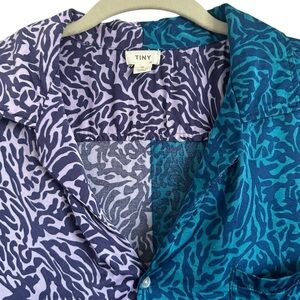 Anthropologie Tiny Postcard Contrast Button Down Top. In bright blue and purple contrasting colors with an all over animal print. This top is light and airy, looks and feels amazing, you will not be disappointed!! Featuring a button front and chest pockets. Made from rayon and viscose.