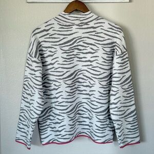 Lovely sweater from Anthropologie, size 1X. Runs similar to XL, please see measurements. Fun zebra stripe with contrast pink trim. Mock neck neckline, long sleeves, pullover style. Very good condition!