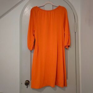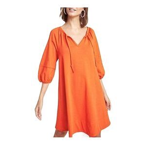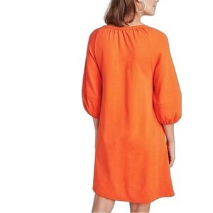 Adorable "Anais" midi dress by Anthropologie! Take your casual and weekend wear up a notch with this cutie! Fantastic trapeze silhouette in a thick jersey in the brightest orange!! Fantastic piece for Lagenlook, but also super pretty on its own! Lots of great details like the fuschia on the ties, stitch detailing on the 3/4 length puff sleeves, gathers at the keyhole neckline. So comfy because this jersey is 100% cotton!