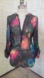 Striking color combination-- black with Magenta/ plum, peacock blue, emerald green, golden yellow, and red-orange. Kind of a Boho/ ikat print. The sleeves and front are sheer, the back is a solid version of the same print. Contrasting print on shoulders, around neck and neckline. Collarless, plunging v-neckline, long sleeves that can be written rolled up with tab and button. Pit to pit 18" Length 26" Excellent condition.
