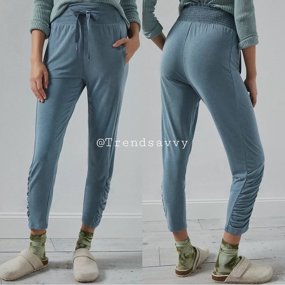 ANTHROPOLOGIE Blue Ruched Joggers Smocked Waist Pants Workout Petite Size LP NWT