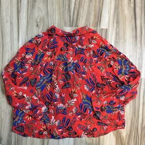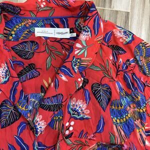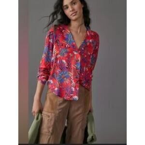 ANTHROPOLOGIE Button Down Top Red Size LP Hummingbirds Colorful Boho Twee Boxy