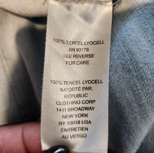 The Chelsea & Theodore Light Blue Lyocell Chambray Midi Skirt in size L features a unique shark bite hem, adding a trendy and bohemian touch to its overall design. Made from tencel lyocel fabric, this skirt is perfect for casual occasions and offers a stylish addition to any woman's wardrobe. The light blue color and midi length make it versatile and easy to pair with different tops and shoes for a variety of chic looks. Elastic waist, pull-on flowy skirt