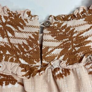 This Anthropologie Current Air linen blend women's floral top in tan and brown, size X-Small, features a round neck with a pullover style and keyhole button on the back. The short balloon sleeves and lightweight material make it perfect for casual, business, or travel occasions during the summer, fall, or spring seasons. The ruffle, button, and embroidered accents add a stylish touch to this breathable blouse, which is easy to care for with hand wash only.