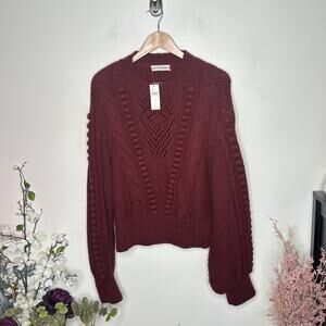 Wrap yourself in cozy sophistication with this Anthropologie Cropped Cable Knit Sweater in a deep Maroon Red hue — a stunning blend of boho charm and quiet luxury. Crafted with a chunky cable knit design, textured bubble sleeves, and a slightly cropped fit, this sweater brings a modern silhouette to a timeless classic.