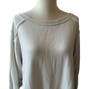 Size Small, very light pastel green, mini length, pull on, pockets, ruffle hem, raw edges, open back.