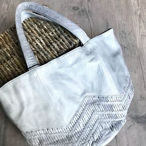 Genuine Leather, Steel light, icy blue, dual top handles, magnetic top closure, unique stitching details on the exterior front, 1 interior middle zip pocket, 1 inside zip pocket, 1 inside pouch pocket. Light typical leather marking on the bottom.