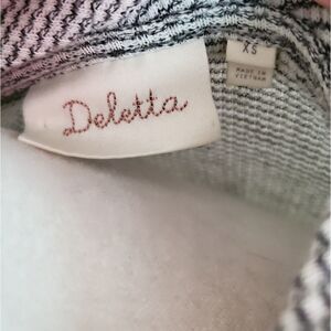 Anthro Deletta fitted half sleeve striped top. Very interesting neckline! Waffle knit half sleeve micro stripe top. Great with jeans or for the office. Cotton Polyester.